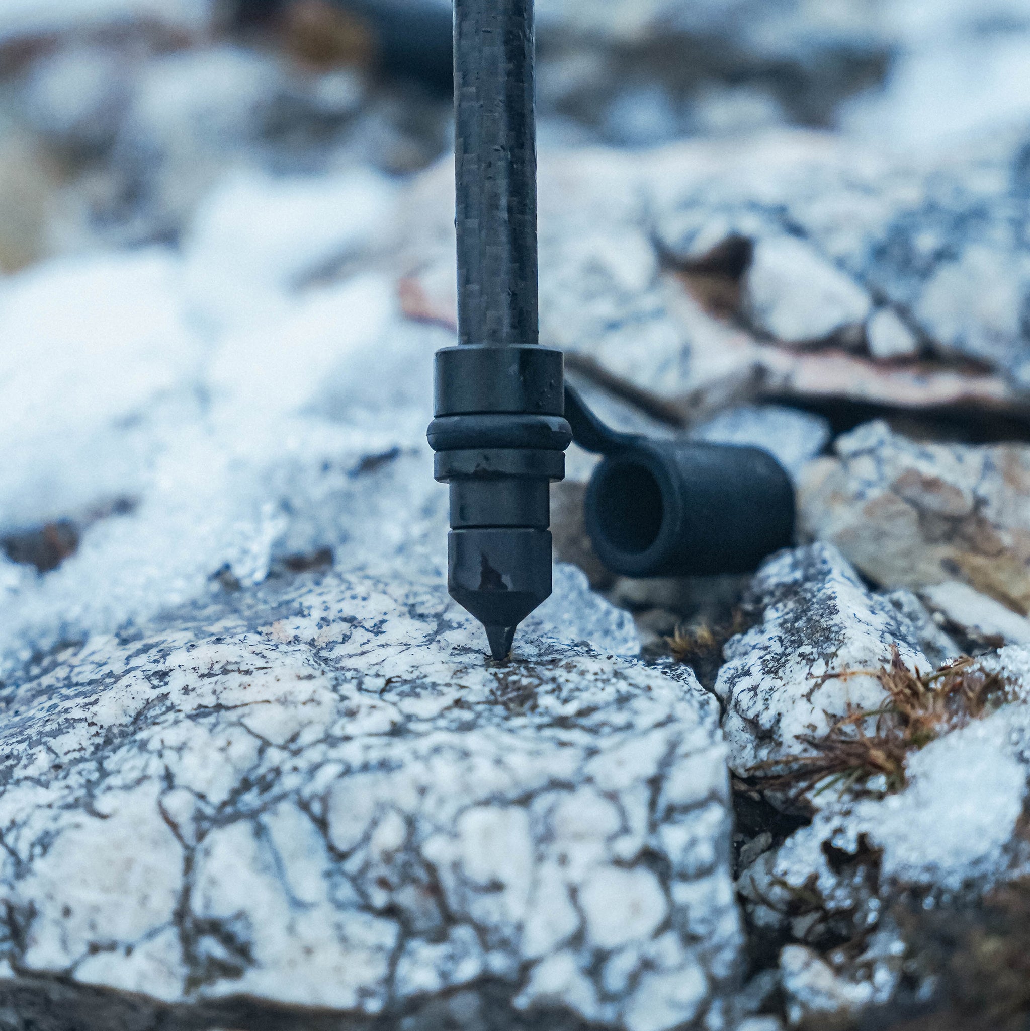 Durable stainless steel tips with tethered synthetic boots to enhance grip on all terrains.