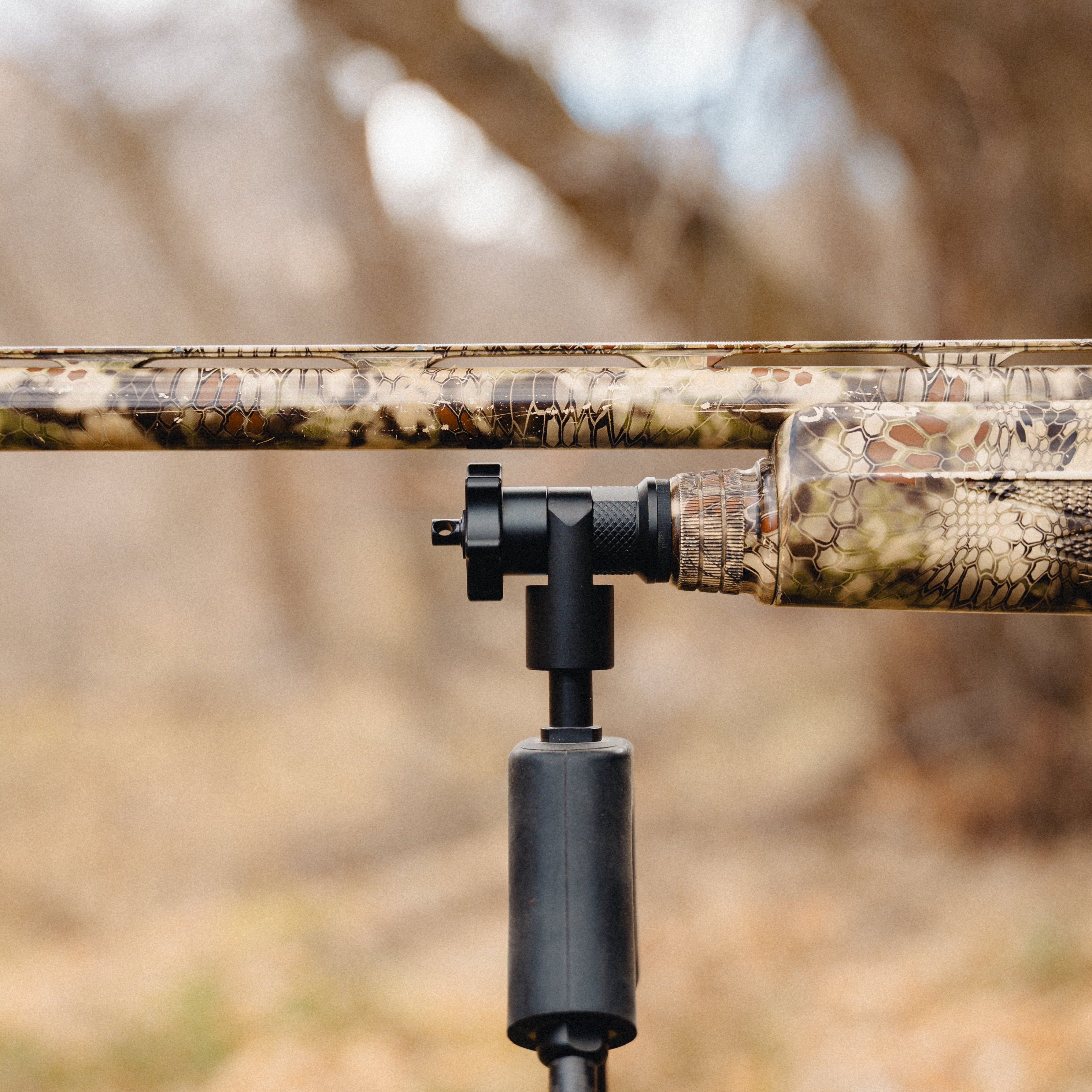 Designed for turkey hunters, this adapter enables bipod use on your shotgun to provide stable, hands-free support while calling or waiting on a bird. It keeps the gun ready and properly oriented without resting it on your knee, helping reduce fatigue and movement during long setups.
